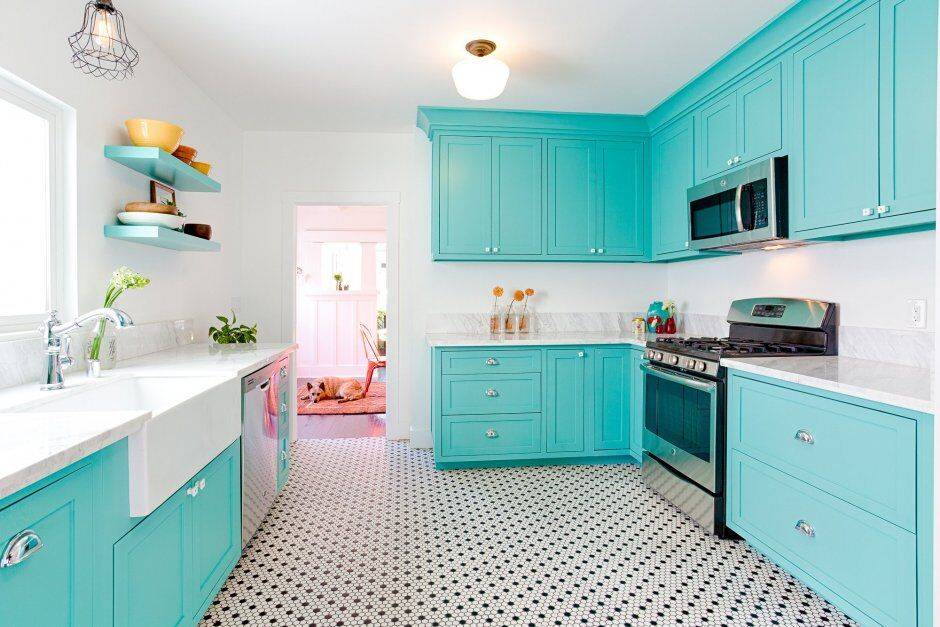 Одним из оптимальных способов преображения кухни является покраска стен, полов или даже потолка в радужные цвета. В таком случае это станет главной отличительной особенностью дизайна, а мебель следует выбрать нейтральных оттенков.