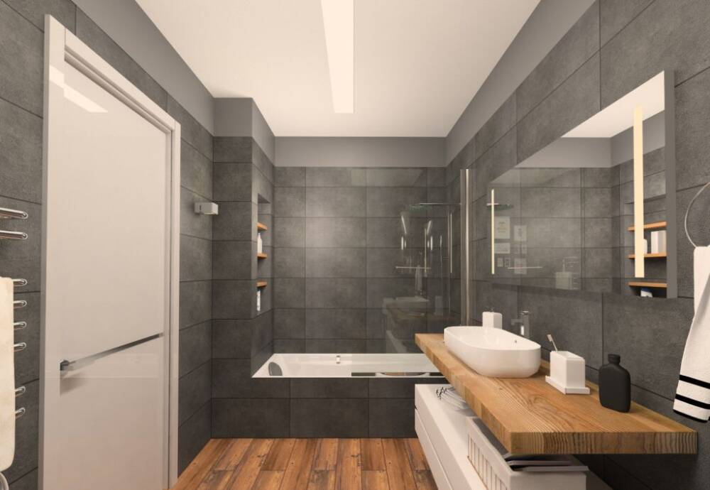 Деревянный пол или деревянная столешница в ванной из натурального дерева - идеальные элементы, но, как несложно догадаться, они требуют особой подготовки. Дерево с каждой стороны пропитывается, а затем покрывается специальным лаком или маслом. Лучшие породы для ванных комнат - лиственница, дуб и бук, а также экзотические мербау, ироко или дусси. Панели, имитирующие доски, также являются хорошим решением для ванной комнаты. Прекрасным дополнением естественного дизайна ванной комнаты станут и более мелкие детали из дерева, такие как рамы зеркал, сиденье для унитаза и емкости для аксессуаров.