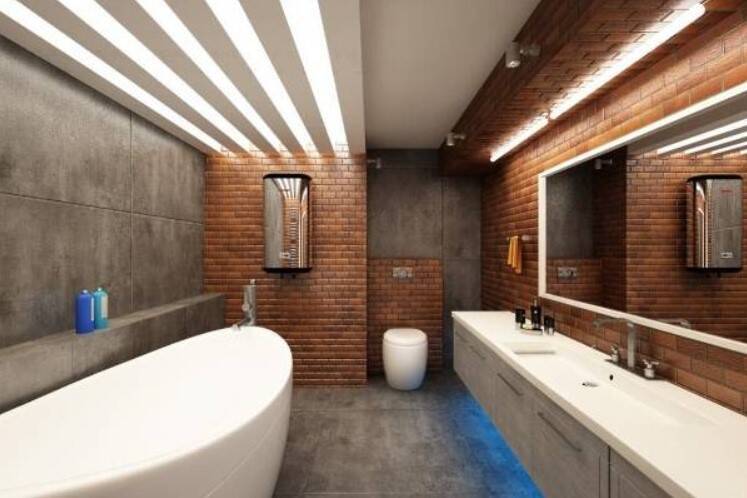 В последнее время очень модно показывать стены из красного кирпича. В сочетании с естественной ванной комнатой, стена из красного кирпича создаст композицию, от которой будет сложно оторвать взгляд. Прекрасным дополнением к нему станут деревянный пол или столешница, бетонная плитка и аксессуары в виде каменных емкостей.